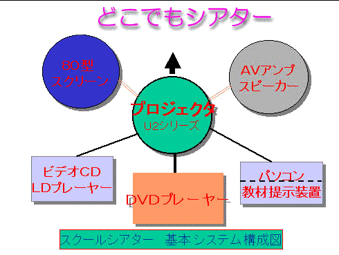 これらを有効に使った発表を簡単にしていただけるようデジタルプロジェクター、大型携帯スクリーンPC対応教材提示装置 などを組み合わせたシステムを「スクールシアターシステム」として提案します |